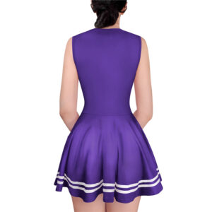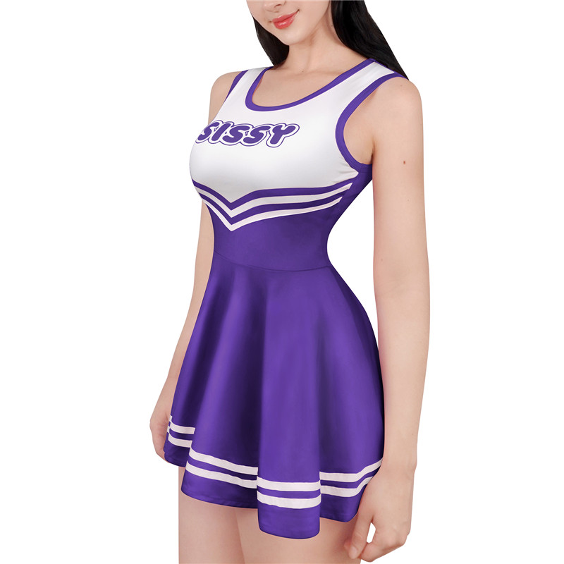 - Cheerleader Collection Dark Purple Sleeveless Dress – Embrace Your Vibrant Style with the Cheer Sissy Mini Dress from our Cheerleader Collection! This eye-catching dark purple sleeveless dress is designed to showcase your bold fashion sense. It features a lively dark purple color block print adorned with ??SISSY?? lettering and charming stripes.